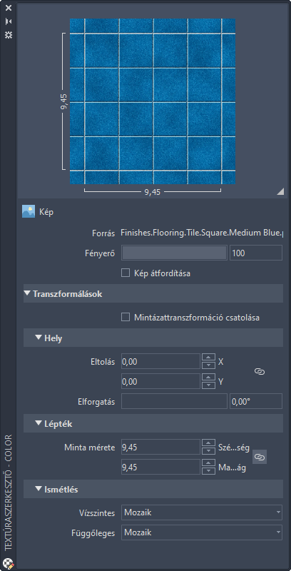 A Textúraszerkesztővel módosíthatók az anyagmintázatok tulajdonságai. Mintázat megnyitásához az Anyagszerkesztőből kattintson duplán az előnézetére.