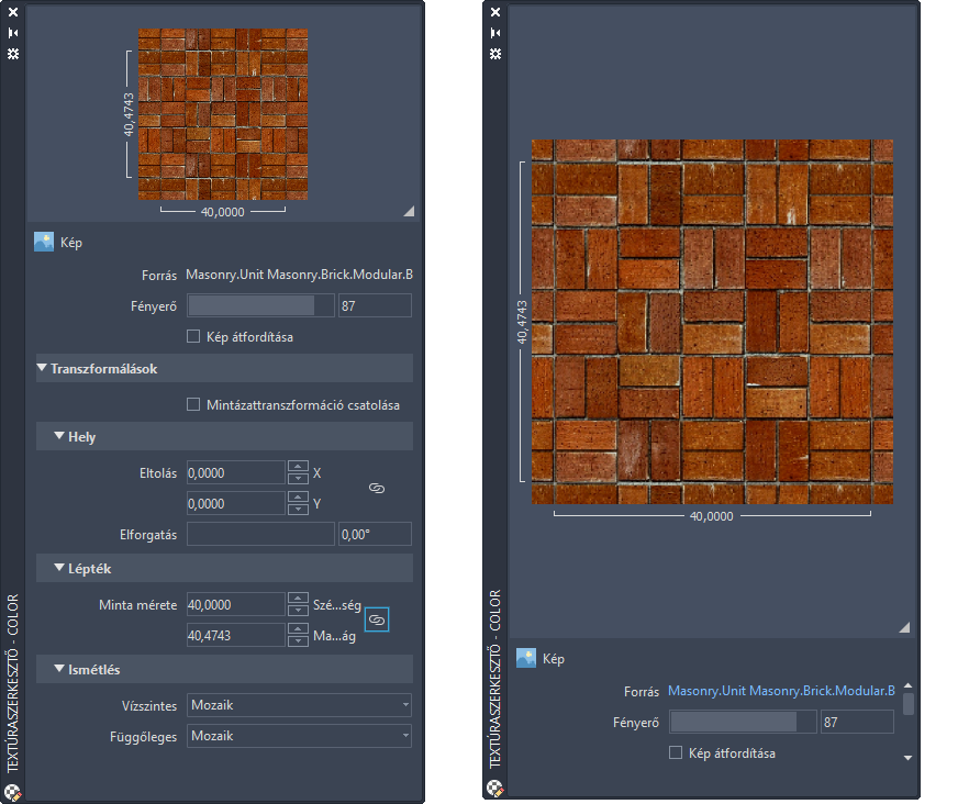 A hely, lépték és ismétlés tulajdonságok aktuális mintázaton végzett módosításainak alkalmazásához ugyanazon anyag más mintázataira válassza a Textúratranszformációk csatolása lehetőséget.