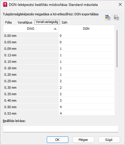 Olyan előre definiált vonalvastagságok jelennek meg, amelyek a lehető legjobban feleltetik meg egymásnak a DGN- és DWG-fájlokban használt vonalvastagságokat. A jobb oldali oszlopban a jobb gombbal történő kattintásra megjelenő helyi menü segítségével akár egyetlen, akár egyszerre több vonalvastagság is másolható és beilleszthető. A Vonalvastagság lapon csak a jobb oldali oszlop tartalma módosítható. A bal oldali oszlop nem módosítható.
