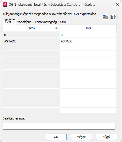 Létező leképezési beállítás: Ha létező leképezési beállítást módosít (még akkor is, ha a DGN-importálási (vagy exportálási) beállítások párbeszédpanelről kezdeményezte egy, a Standardtól eltérő beállítás módosítását), a leképezési táblázatban felsorolt tulajdonságok nem az importált DGN-fájlból, illetve az exportált rajzfájlból származnak.