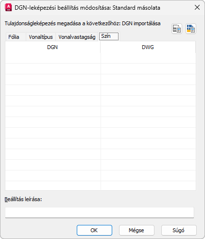 Megfeleltetheti egymásnak a DGN- és DWG-fájlok színértékeit. Alapértelmezés szerint a Szín lap üres, és a program az alapértelmezett színleképezést használja. A DGN-színértékek a hozzájuk legközelebb eső AutoCAD-színértékeknek, az AutoCAD-színértékek pedig a hozzájuk legközelebb eső DGN-színértékeknek felelnek meg. A Szín lap az egyetlen olyan lap, amelynek mindkét oszlopa módosítható. A bal oldali oszlopban nem ismétlődhetnek az értékek. A színegymáshozrendelés módosításához kattintson a jobb gombbal valamelyik oszlopra, és a megjelenő helyi menüből válassza a Szín hozzáadása menüpontot.
