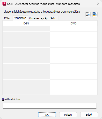 Leképezési beállítások importálása: Ha azért jelent meg a DGN-leképezési beállítás módosítása párbeszédpanel, mert a DGN-importálási beállítások párbeszédpanelről egy új beállítás létrehozását kezdeményezte, akkor a DGN oszlop az importált DGN-fájlban definiált összes vonaltípust, továbbá a DGN-fájl létrehozásakor használt DGN-sablonfájlt tartalmazza.