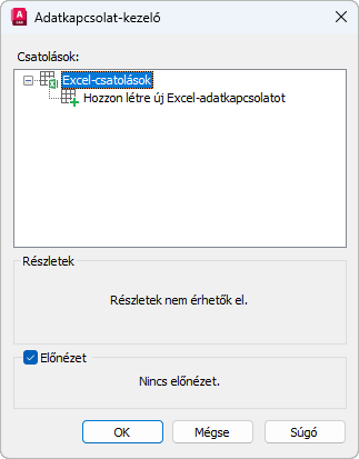 Megjelenik a csatolt adatok előnézete, ahol az adatok úgy látszanak, mint a rajz táblázatában. Ha éppen nincs kijelölve adatkapcsolat, nem jelenik meg előnézet.