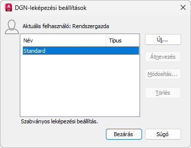 Leképezési beállításkészletek létrehozását, átnevezését, módosítását, illetve törlését teszi lehetővé a DGN-adatok importálásához és exportálásához.