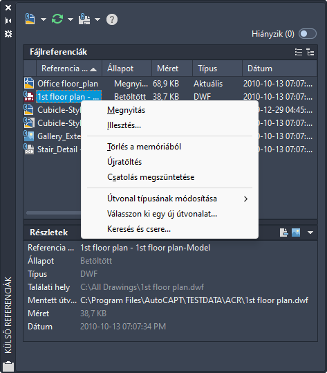 Ha a módosításra kijelölt referencia külső referenciákkal vagy blokkdefiníciókkal rendelkezik, a referencia és annak beágyazott referenciái a Referencia szerkesztése párbeszédpanelen választhatók ki. A beágyazott referenciák csak akkor jelennek meg, ha a kijelölésre kiválasztott objektum egy beágyazott referencia része. Egyszerre csak egy referencia választható ki módosításra. OLE-objektumokat tartalmazó referencia módosításakor az OLE-objektumok megjelennek, de szerkesztés céljából nem választhatók ki.
