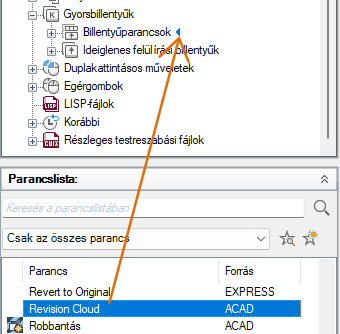 Billentyűparancs létrehozásához a Parancslista területről húzzon át egy parancsot a <fájlnév> testreszabási beállításai terület Billentyűparancsok csomópontjába.