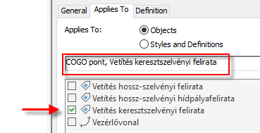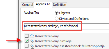 Például vezérlővonal kereszteződés címkézéséhez a keresztszelvénynézetben tulajdonságkészlet adatokkal válassza ki a Kereszteződés keresztszelvény felirat és a Vezérlővonal elemeket az Alkalmazás lapon a Stíluskezelőben a tulajdonságkészlet-definíció beállításakor:
