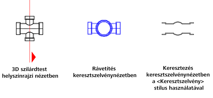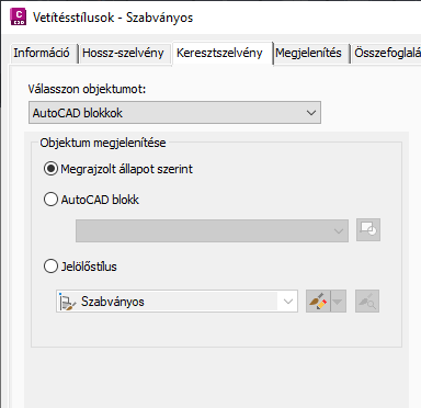 A vetített objektumok a keresztszelvénynézetekben az alábbi stílusokat használják: