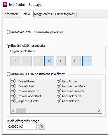 Jelölőstílusok beállíthatók AutoCAD pontok, egyedi jelölő szimbólumok, vagy blokkok használatához.