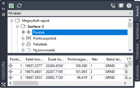 A listanézetet az Eszköztár fák táblaként jelenítik meg bizonyos elemekhez. Néhány esetben ez az információ szerkeszthető. Az alábbi ábra egy Kereső listanézetet mutat amiben pontok láthatóak: