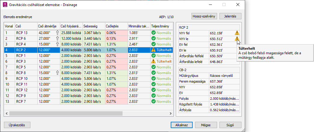 A Gravitációs hálózat elemzése paranccsal átméretezheti a csöveket, visszaállíthatja a folyásfenekeket, és a HEC-22 szabványok alapján kiszámíthatja az energia- és nyomásvonalakat.