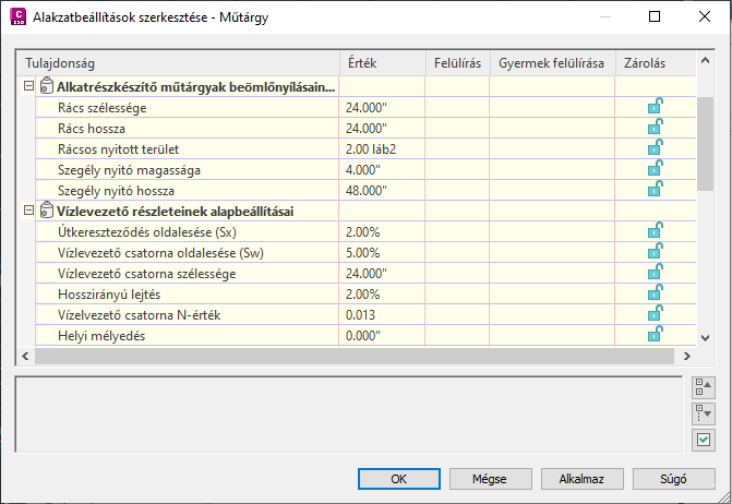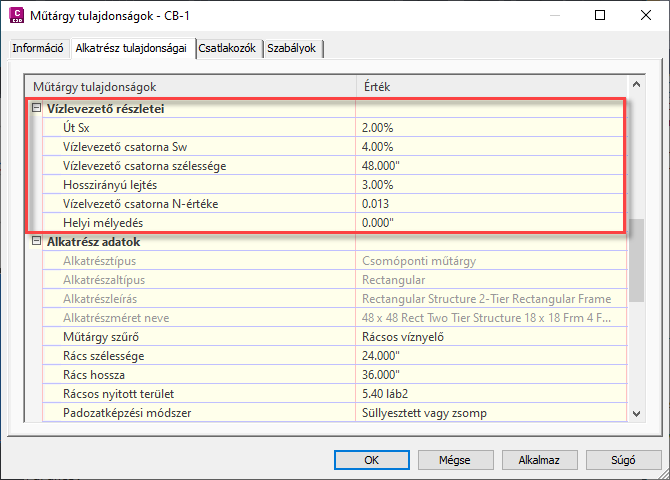 A Műtárgy tulajdonságai párbeszédpanel Vízlevezető részletei szakaszában definiálhatja a beömlőnyílás körüli útfelület tulajdonságait. Ezeket a tulajdonságokat Gravitációs hálózat elemzése parancs használja a beömlőnyílás elemzésszámításaihoz.