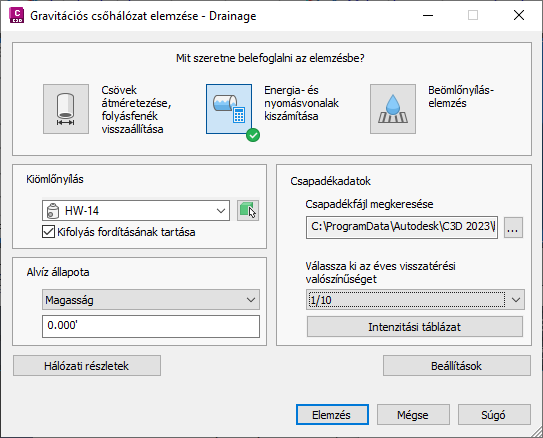 Három elemzéstípus közül választhat: Csövek átméretezése és folyásfenekek visszaállítása, Energia- és nyomásvonalak kiszámítása és Beömlőnyílás-elemzés.