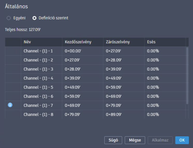 A megadottak szerint. Lehetővé teszi a csatornaszakaszok automatikus létrehozását a kiindulási vonal mentén történő esésváltozások alapján.