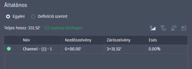 Kezdőszelvény. Az egyes csatornaszakaszok kezdőszelvényét jeleníti meg. Ennek az értéknek a megadott szelvénytartományba kell esnie, különben a rendszer hibát jelez.