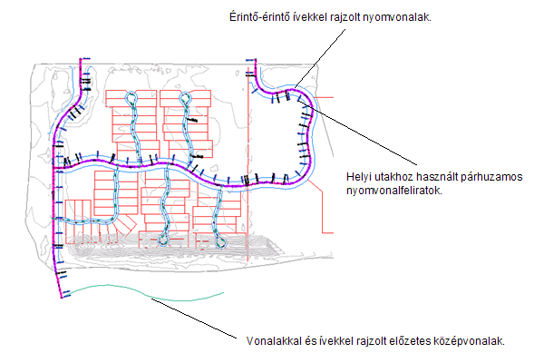 A nyomvonalobjektumok utak tengelyeit, csőhálózatokat és egyéb kivitelezési kiindulási vonalakat ábrázolhatnak. A vízszintes nyomvonalak létrehozása és megadása az utak, vasutak és helyszínek tervezésének egyik első lépése. A nyomvonal-geometria megrajzolható vonalláncként, majd ebből a geometriából létrehozhatja az elnevezett nyomvonalakat. A jobb kezelhetőség érdekében a nyomvonalobjektum létrehozható a Nyomvonal-tervezési eszközökkel is. A nyomvonalak fogók vagy a Nyomvonal-tervezési eszközök eszköztáron található parancsok segítségével is szerkeszthetők. A nyomvonal objektumok közötti érintkezések automatikusan megmaradnak.