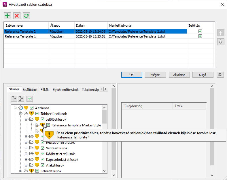 Amikor egy újabb referenciasablont csatol a rajzhoz, az a sablonlista tetejére kerül legmagasabb prioritású sablonként, és riasztás jelenik meg, amikor a komponensek egy másik referenciasablon komponenseinek a másolatai. További információ a másodpéldányok kezeléséről: