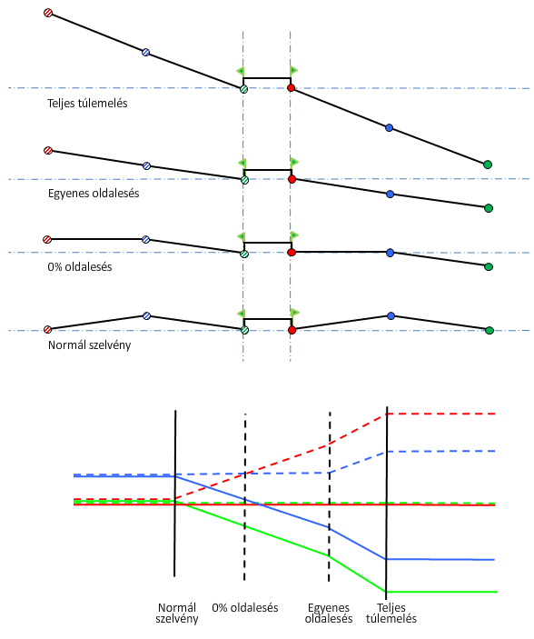 - Egy tipikus túlemelési nézet az egyes esetekre. A túlemelési nézet színezett és szaggatott vonalai egybeesnek a keresztszelvények pontjaival.