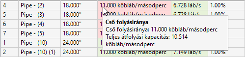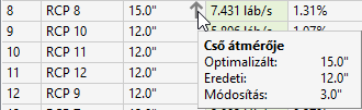 Ha az Általános lapon a Csövek átméretezése és folyásfenekek visszaállítása elemzéstípus lett kiválasztva, és az egyik cső átmérője át lett méretezve, az oszlop egy felfelé vagy egy lefelé mutató nyilat fog tartalmazni. Ha a nyíl fölé viszi a mutatót, megjelenik egy eszköztipp, amely a cső átméretezését ismerteti.