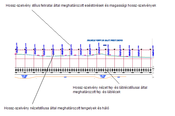 Egy hossz-szelvénynézet magába foglalhat egy vagy több hossz-szelvényt, az X tengely mentén lévő többszörös fej- és lábléccel, a háló felett vagy alatt. A fej és láblécek ellátják a hossz-szelvényeket olyan, a mérnöki elemzést segítő adatokkal mint a szelvényezés, magasság vagy vízszintes geometria.
