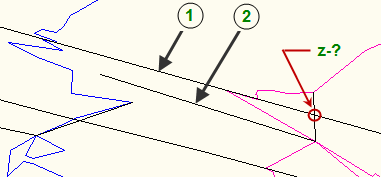 A következő rajzban két metsző törésvonalra láthat példát, amelyek érvénytelen feltételt okoznak, ha az (1. és a 2.) törésvonal szintmagassága eltér a metszéspontban.