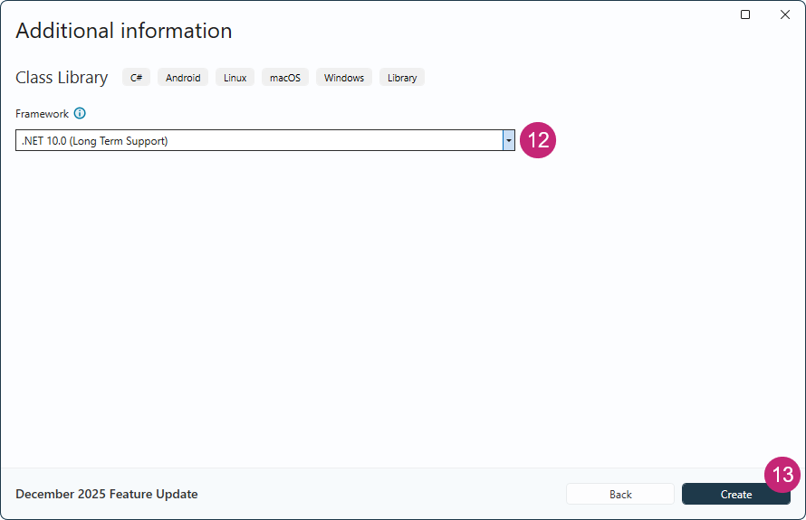 - In the Additional Information dialog box, from the Framework drop-down list, select .NET 10.0 (Long Term Support).