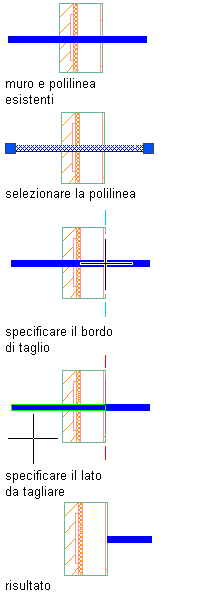 Per tagliare linee, polilinee, archi, cerchi, tratteggi, poligoni AEC, estrusioni di elementi massa o vani lungo un bordo selezionato o lungo un qualsiasi segmento retto di un disegno al tratto AEC, attenersi alla procedura indicata di seguito. Questa procedura consente di tagliare con facilità i disegni al tratto lungo i componenti muro.
