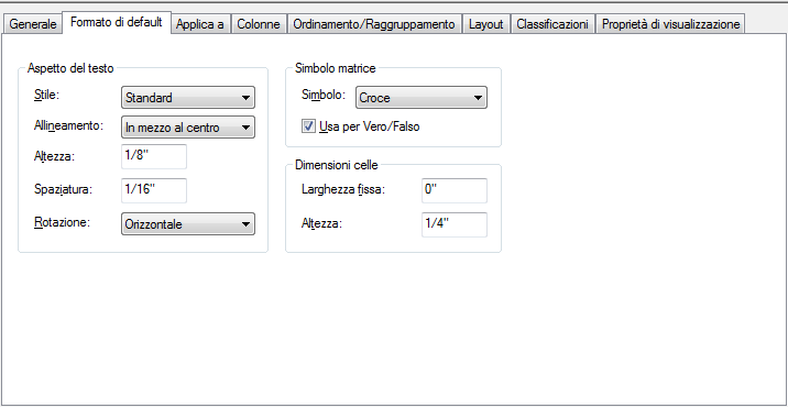 - Selezionare o deselezionare Usa per Vero/Falso per specificare se per i valori vero/falso devono essere utilizzati i simboli matrice o il testo della misura di grandezza.