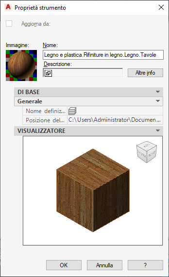 Nota: La definizione di materiale selezionata come modello definirà tutte le impostazioni iniziali del materiale, ad eccezione del materiale di rendering. Tali impostazioni includono il layer, il colore, il tipo di linea, le assegnazioni del tratteggio di superficie e il funzionamento del materiale quando viene utilizzato in una sezione.