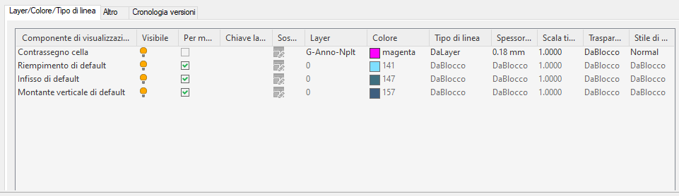 Nell'elenco di default dei componenti sono inclusi solo i tre elementi di base e i contrassegni delle celle.