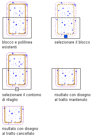 . Viene cancellata tutta la parte del disegno al tratto inizialmente selezionato esterna al contorno di ritaglio. Se si cancella il contorno di ritaglio, i contorni delle entità con contorno chiuso interne all'area di ritaglio vengono ridisegnati, invece gli oggetti con contorno aperto ritagliati restano aperti.