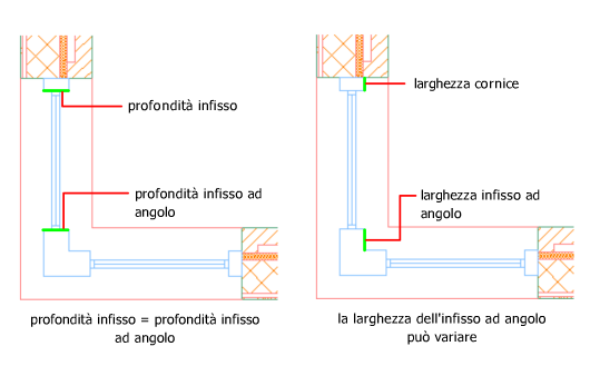 In una finestra ad angolo, la profondità dell'infisso e la profondità dell'infisso ad angolo sono uguali. La larghezza dell'infisso e la larghezza dell'infisso ad angolo possono variare. Il lato più corto dell'infisso ad angolo viene utilizzato per determinare la larghezza di tale infisso.