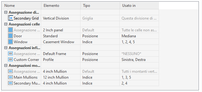 Dopo aver creato le definizioni degli elementi di uno stile di facciata continua, è possibile assegnarle ai singoli tipi di elementi della facciata continua: divisioni, riempimenti delle celle, infissi e montanti verticali.