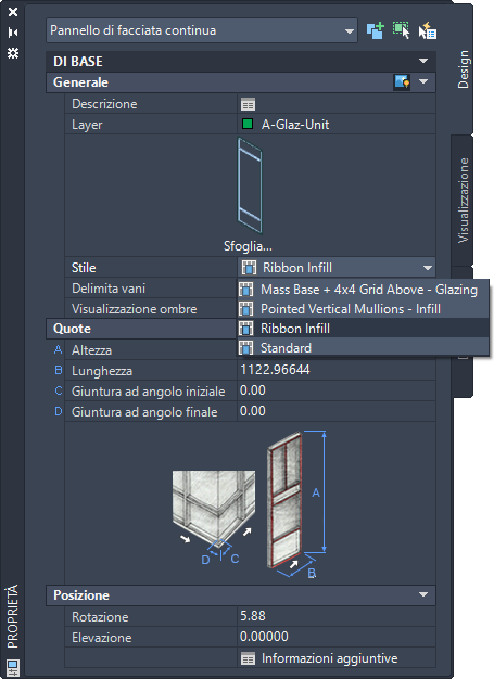 Per selezionare un differente stile per il pannello facciata continua, attenersi alla procedura indicata di seguito.