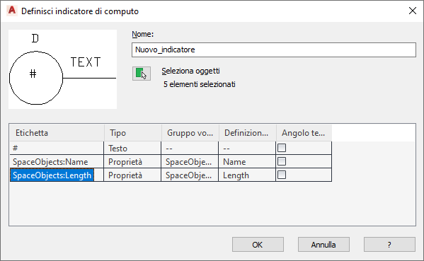 Per creare un indicatore di computo che includa e visualizzi i dati del gruppo voci di computo relativi ad un determinato oggetto nel disegno, attenersi alla procedura indicata di seguito.