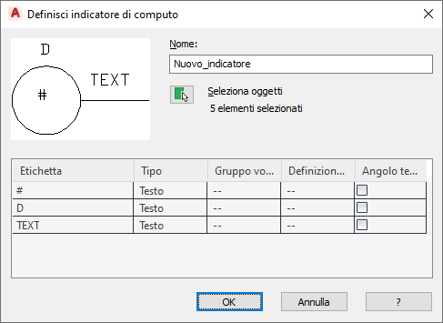 L'indicatore di computo può essere creato disegnando un simbolo e aggiungendo testo come segnaposto per gli attributi oppure aprendo e personalizzando un indicatore di computo esistente. Quando si crea un indicatore di computo, a ciascun attributo viene assegnato un nome univoco (chiamato indicatore di attributo), il cui nome è formato dalla combinazione dei nomi della definizione gruppo voci di computo e della definizione di proprietà associate. Quando l'indicatore di computo è ancorato ad oggetti a cui viene applicata la definizione gruppo voci di computo, viene visualizzato il valore della proprietà identificata dall'indicatore di attributo.