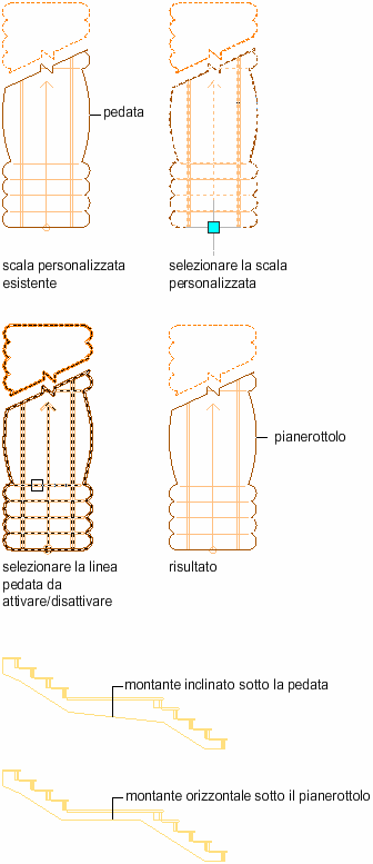 Per convertire la pedata di una scala personalizzata in un pianerottolo o per convertire il pianerottolo di una scala personalizzata in una pedata, attenersi alla procedura indicata di seguito.