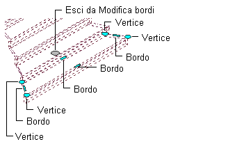 Per modificare la faccia della pedata è possibile selezionare un grip Bordo o un grip Vertice. Per la modifica della faccia della pedata di una scala personalizzata vengono visualizzati i grip seguenti:
