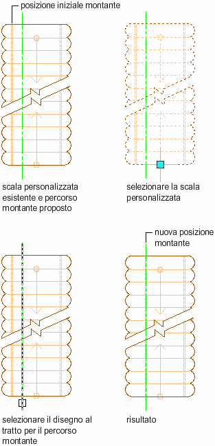 Per sostituire il percorso montante di una scala personalizzata esistente con un nuovo percorso montante tramite la selezione di disegno al tratto, attenersi alla procedura indicata di seguito. Per poter essere selezionato come percorso montante sostitutivo, il disegno al tratto deve essere contenuto nella scala e deve coprire l'intera lunghezza della scala.