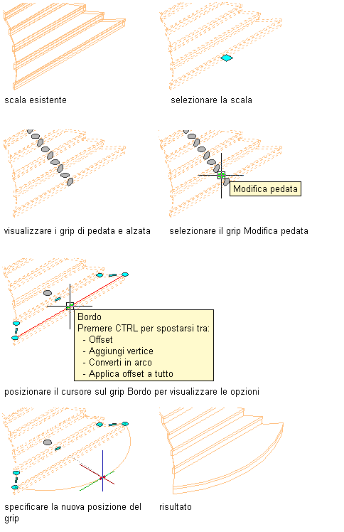 Per convertire il bordo della pedata di una scala personalizzata in un arco, attenersi alla procedura indicata di seguito.