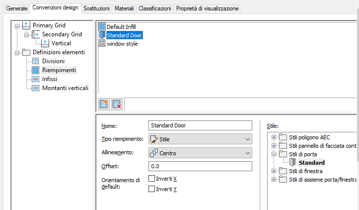 Stili di facciata continua. Viene visualizzato l'elenco dei tipi di elemento.