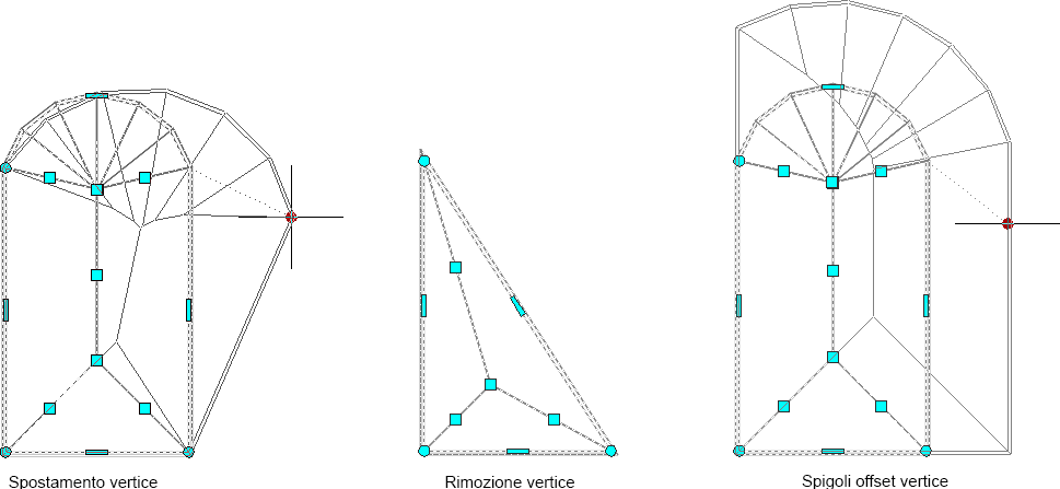 • Rimuovi: utilizzare questa modalità per rimuovere un vertice. I segmenti vicini vengono sostituiti con un nuovo bordo. Il nuovo bordo eredita le proprietà dal bordo con il numero inferiore tra quelli rimossi.