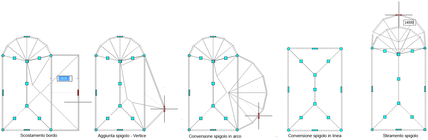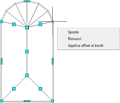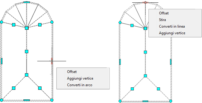 Il grip Bordo presenta quattro modalità di modifica: Offset, Aggiungi vertice, Converti in arco, Converti in linea e Stira.