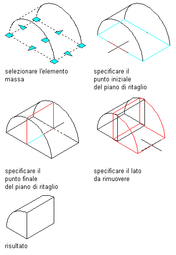 Per ritagliare un elemento massa, attenersi alla procedura indicata di seguito. Il piano di divisione specificato funge da linea di ritaglio e si specifica la parte dell'elemento massa da rimuovere.