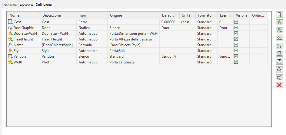 Le proprietà automatiche vengono recuperate in modo dinamico dall'oggetto. La maggior parte delle proprietà automatiche deve essere inserita in una definizione gruppo voci di computo basata sullo stile, sebbene i valori possano variare per ciascuna istanza dell'oggetto. Ad esempio, le proprietà "Larghezza porta" e "Altezza porta" vengono ricavate automaticamente dagli oggetti porta. Invece di includere tali proprietà in una definizione gruppo voci di computo basata sull'oggetto da associare a ciascuna porta, è preferibile e più efficiente includerle in una definizione gruppo voci di computo basata sullo stile con la possibilità di fornire un valore per ciascun oggetto porta di quello stile.