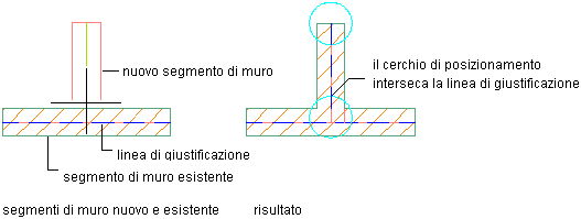 Posizionamento di muri con linea di giustificazione che interseca il cerchio di posizionamento