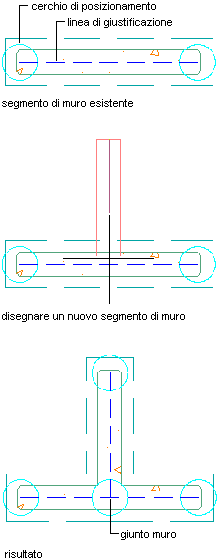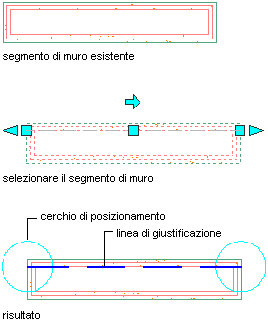 Nei punti iniziale e finale di ciascun segmento di muro è presente un cerchio di posizionamento. Il punto centrale di ciascun cerchio di posizionamento coincide con il punto iniziale o finale della linea di giustificazione del muro.