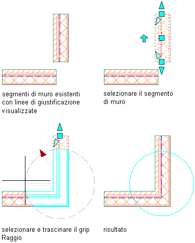 I cerchi di posizionamento e le linee di giustificazione vengono visualizzati su tutti i muri del disegno. Inoltre, alla selezione del muro, vengono visualizzati i grip Raggio di posizionamento a livello di ciascun cerchio di posizionamento. Spostare il grip per aumentare o diminuire il raggio del cerchio di posizionamento.