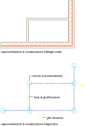 Le linee di giustificazione del muro e dei cerchi di posizionamento sono funzioni degli oggetti muro che vengono utilizzati per definire le condizioni di posizionamento. Queste funzioni sono disponibili per i muri solo nella rappresentazione di visualizzazione diagnostica o quando si attiva la visualizzazione delle linee di giustificazione dei muri.