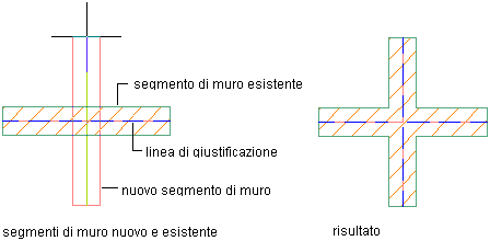 Quando i muri si intersecano e sono posizionati in modo corretto, nel punto di intersezione delle linee di giustificazione del muro viene creato un nuovo giunto muro. La posizione esatta del giunto di muro dipende dalla posizione del punto finale del segmento del nuovo muro. In molti casi, la posizione del giunto di muro non coincide con la linea d'asse del segmento del muro esistente. La posizione del giunto di muro dipende da una distanza media ponderata tra i punti finali del segmento di muro, nonché dallo spessore dei segmenti di muro.